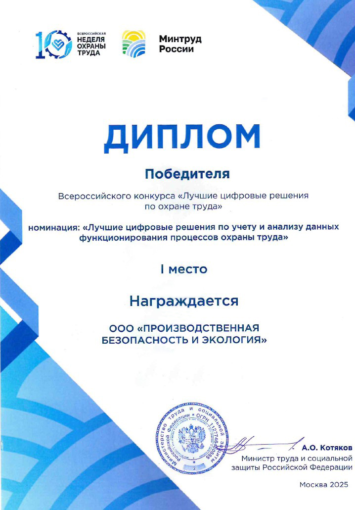 Компания «Производственная безопасность и экология» одержала победу на Всероссийском конкурсе Минтруда, получив первое место в престижной номинации за лучшие цифровые решения.