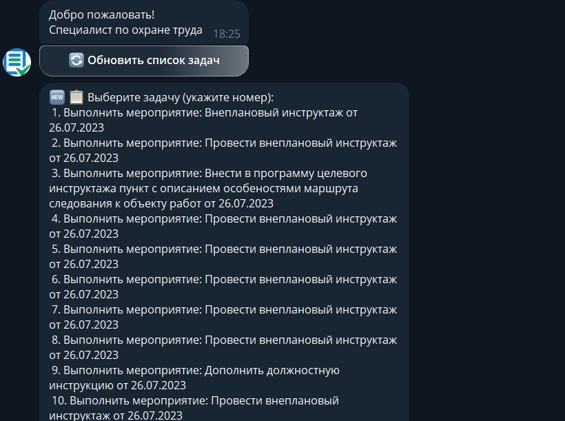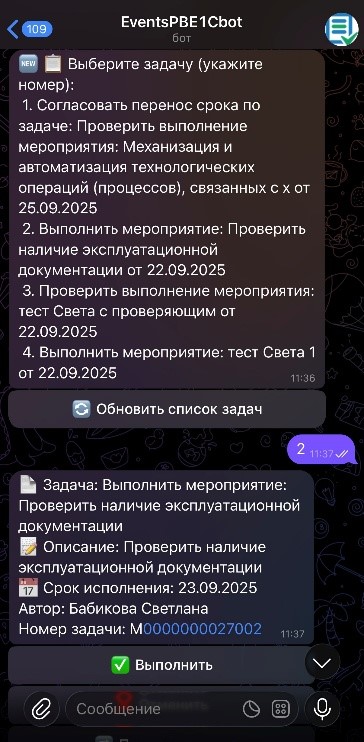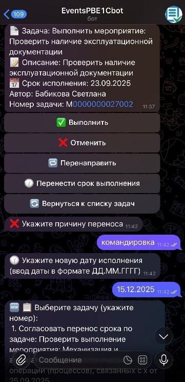 • исполнение / перенаправление / перенос срока выполнения мероприятий через чат-бот;