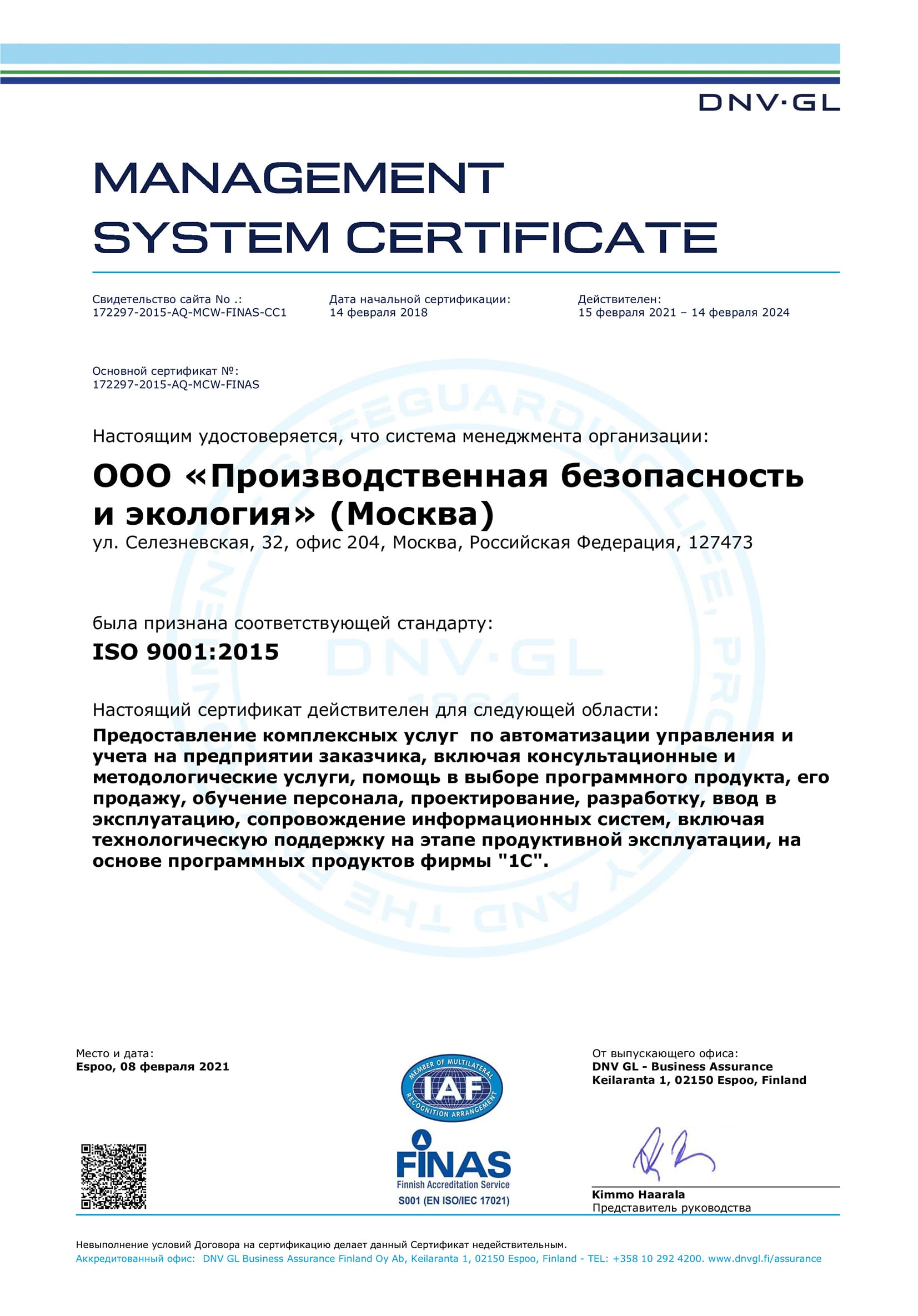 Подтверждающий сертификат получен в феврале 2021г. по результатам проведенного аудита. Проверку осуществляло международное сертификационное общество DNV GL.