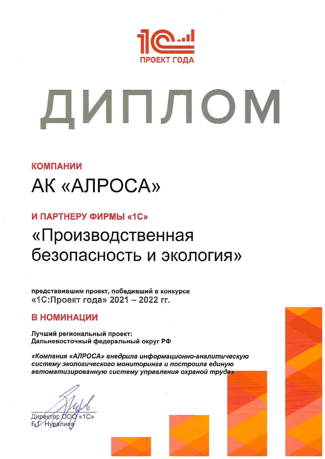 По результатам проекта в компании «АЛРОСА» внедрили информационно-аналитическую систему экологического мониторинга и построили единую автоматизированную систему управления охраной труда. Компания «ПБЭ» выступила исполнителем проекта и провела автоматизацию на базе программных продуктов «1С:Производственная безопасность. Охрана окружающей среды» и «1С:Производственная безопасность. Комплексная».