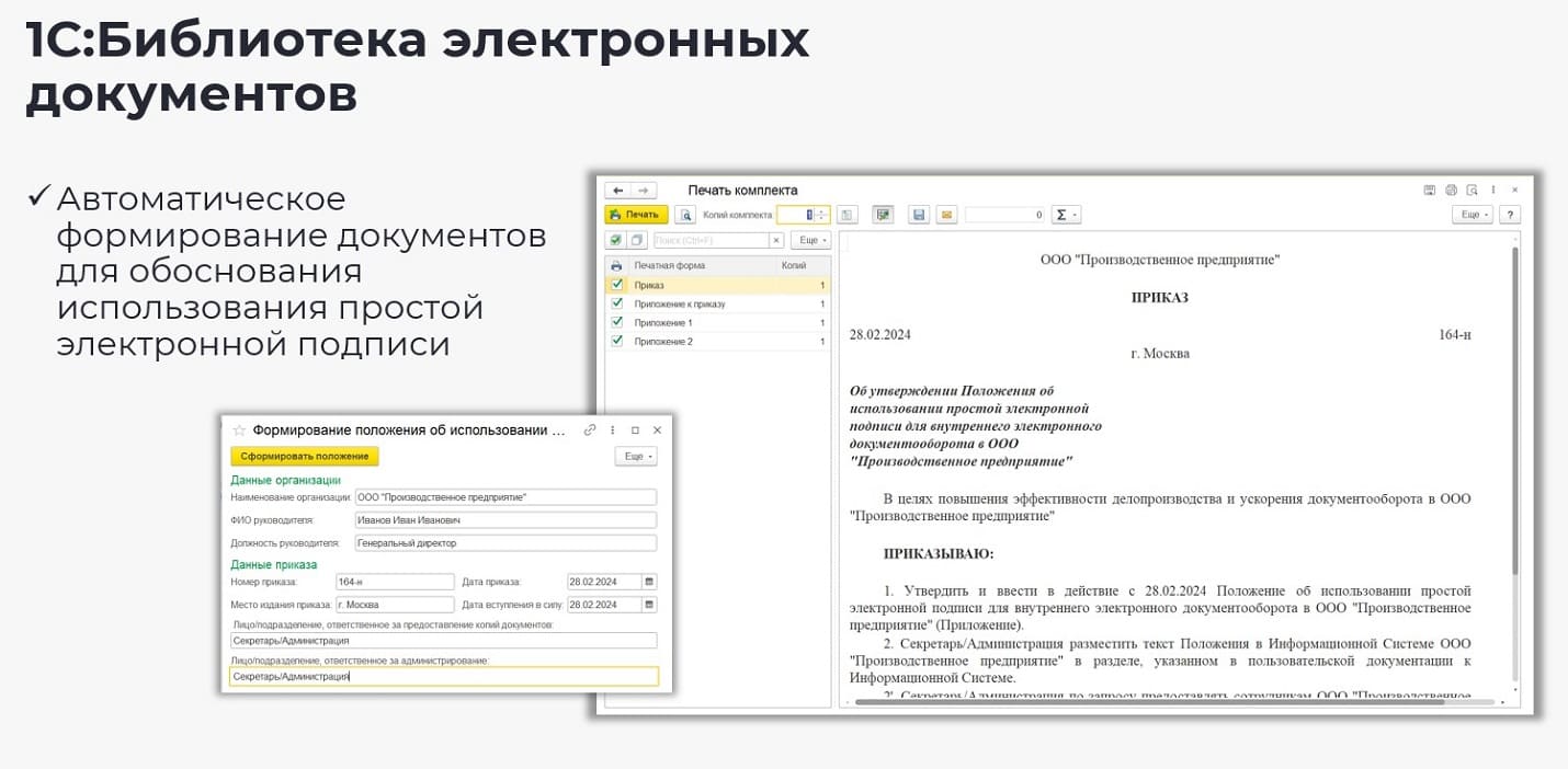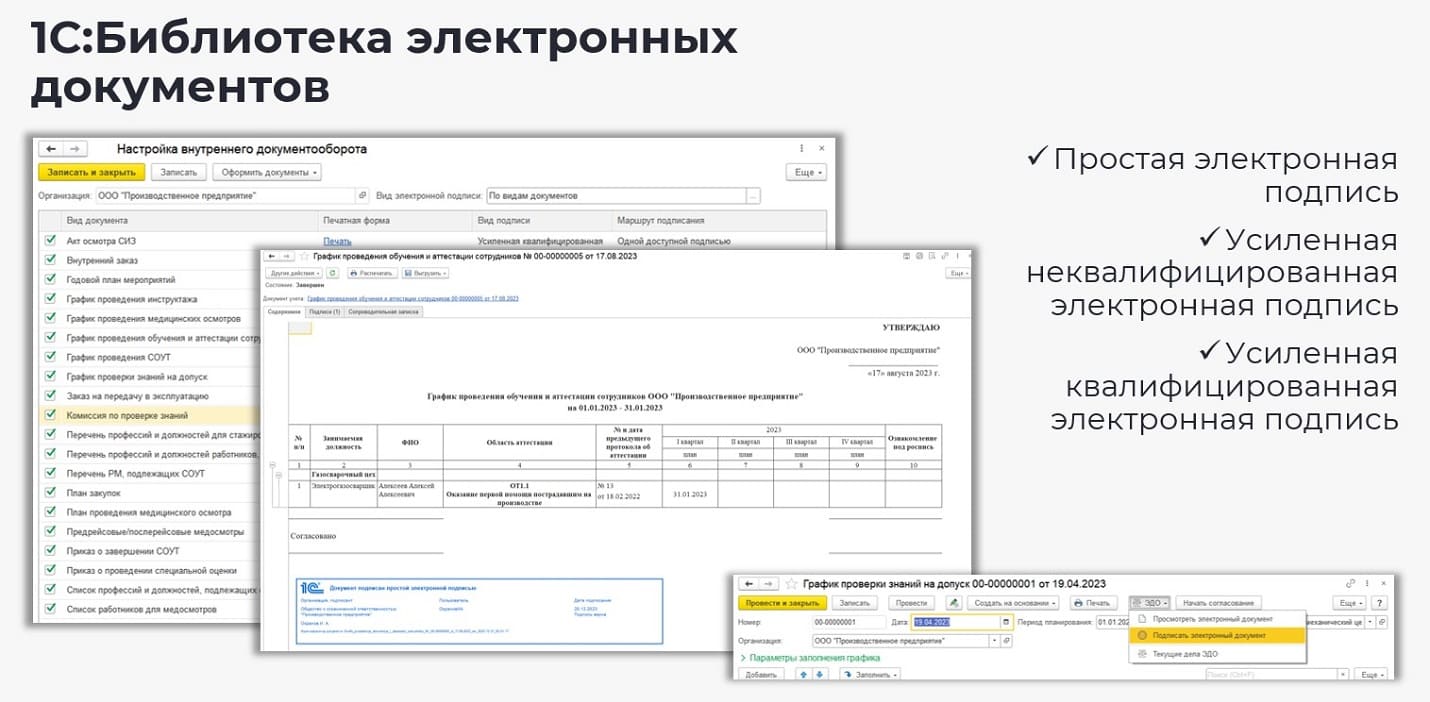 В связи с этим в программных продуктах компании реализован механизм электронного подписания документов – 1С:Библиотека электронного документооборота. Он позволяет подписывать документы, существующие в системе разными видами электронных подписей: простой электронной подписью, усиленной неквалифицированной электронной подписью и усиленной квалифицированной электронной подписью.