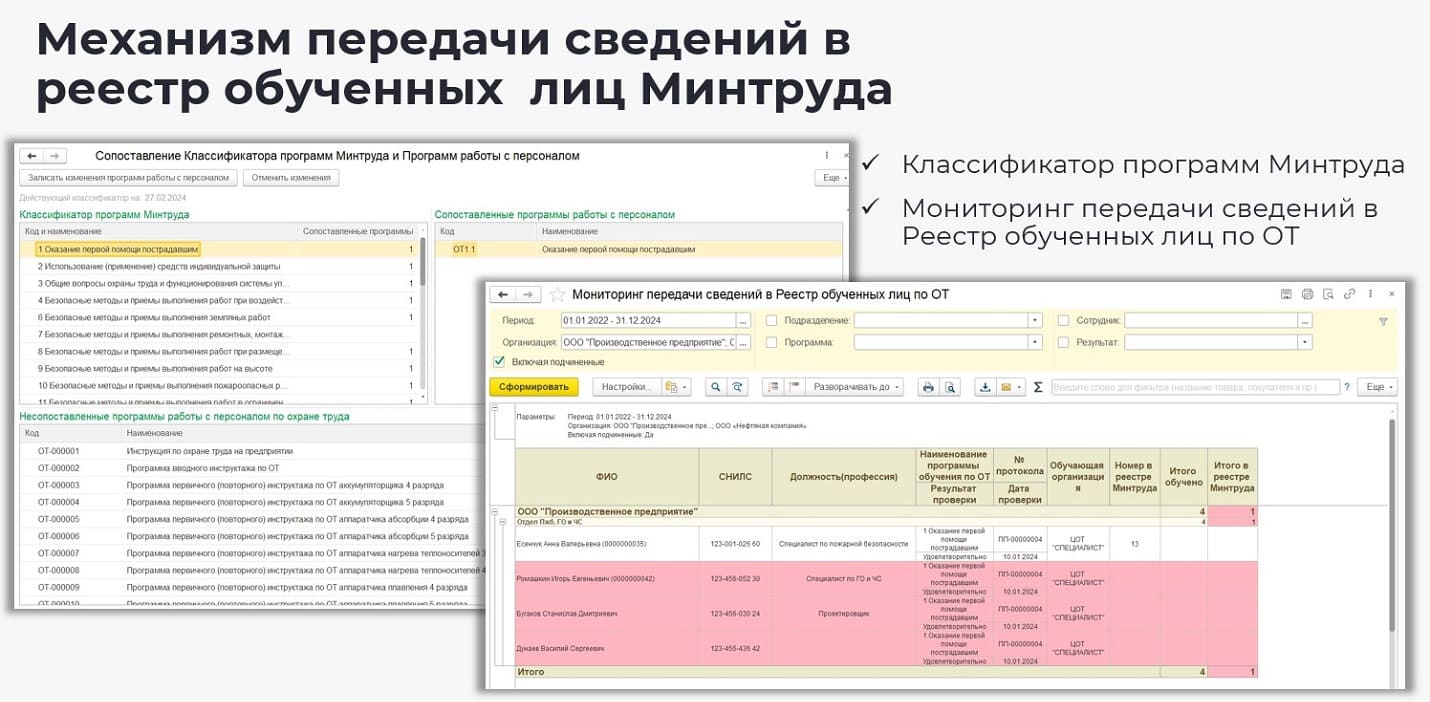 Для контроля передачи данных в реестр Минтруда используется инструмент «Мониторинг передачи сведений в реестр обученных лиц по ОТ», который отслеживает факты прохождения обучений, для которых отсутствует регистрация в реестре обученных.