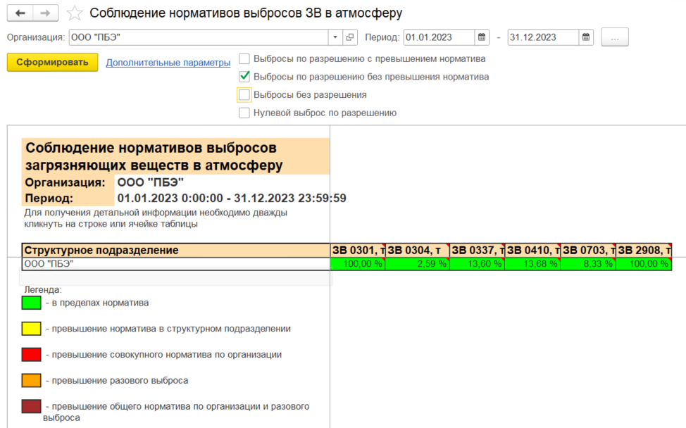 Рис. 6. Аналитический отчёт «Соблюдение нормативов выбросов загрязняющих веществ в атмосферу»