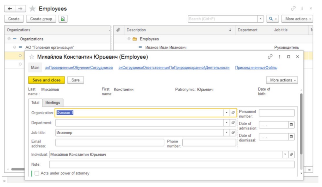 Рис. 1. Элемент справочника «Сотрудник» с частичным переводом
