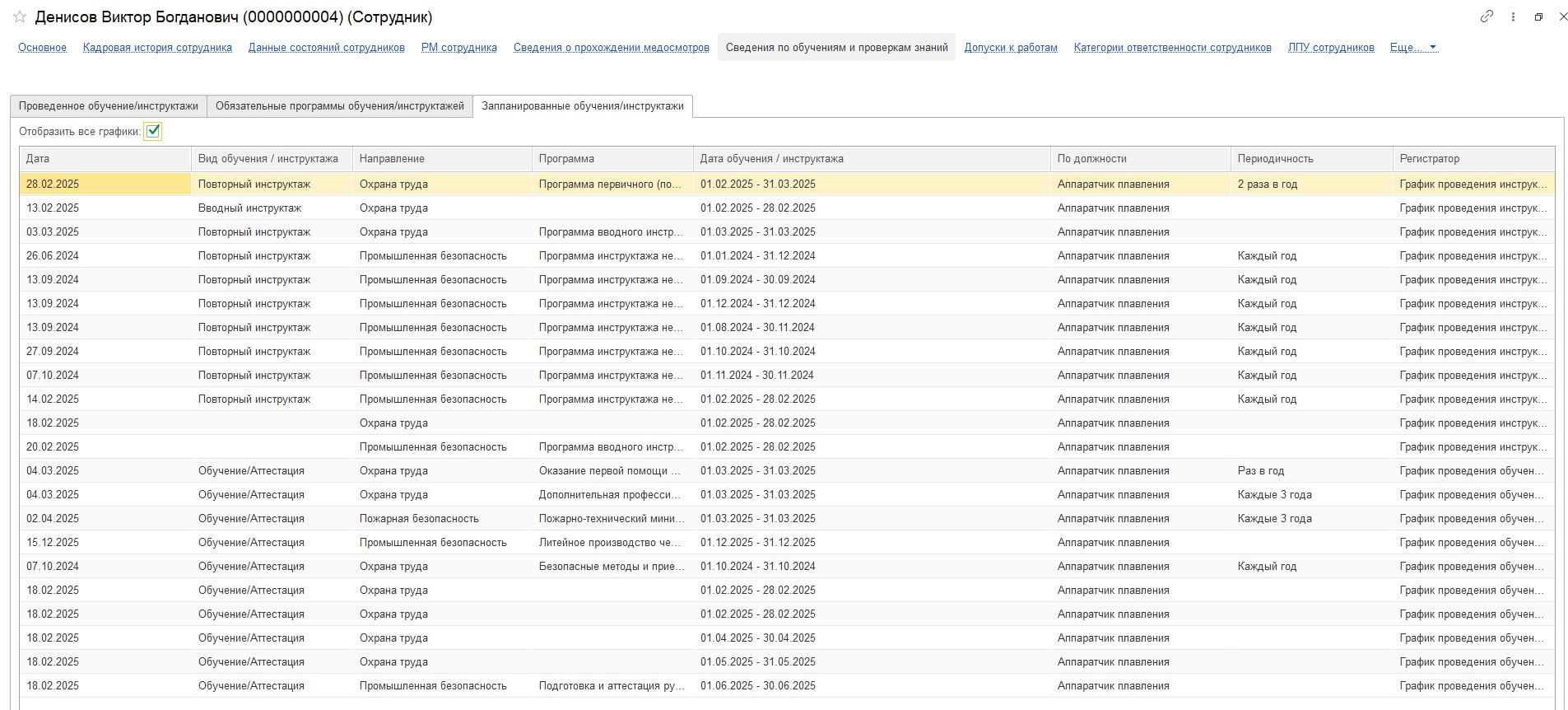 Теперь в карточке сотрудника отображаются все запланированные обучения и инструктажи из графиков.
